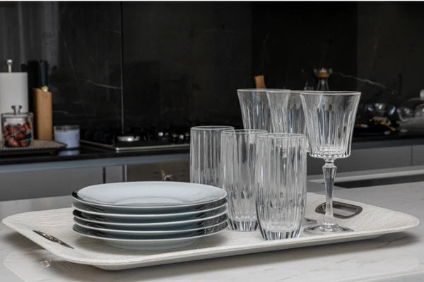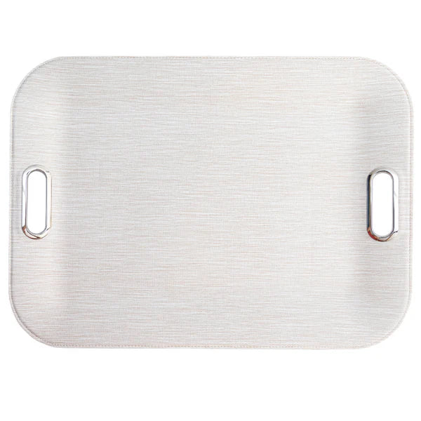 Nuestra bandeja grande combina la apariencia de la tela con la practicidad del vinilo. Es súper fácil de limpiar, resistente a las manchas, duradera y resistente. A pesar de su robustez, es ligera y fácil de transportar gracias a sus asas metálicas. Una opción versátil y práctica para diversos usos.