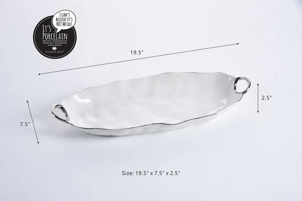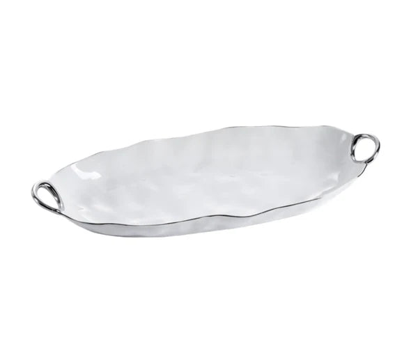 Servidor largo y profundo de nuestra colección "Asa con Estilo". Esta bandeja es ideal para servir una variedad de panes recién cortados o aperitivos, desde champiñones rellenos hasta chuletas de cordero y yakitori. Espárragos, zanahorias, judías verdes e incluso un pescado entero quedan espectaculares en esta pieza. Porcelana blanca brillante con asas suaves y elegantes de titanio plateado. Apto para uso alimentario. Apto para lavavajillas. Apto para horno hasta 500°. Fácil de limpiar.