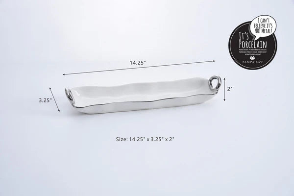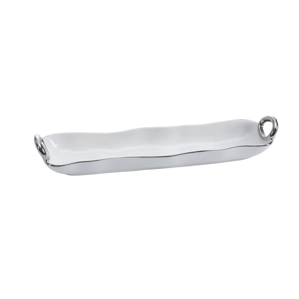 Bandeja para Galletas con Asa Elegante. Perfecta para galletas, galletitas y otros pequeños dulces. Impresionante porcelana blanca con asas suaves y fluidas de titanio plateado. Apta para alimentos, lavavajillas y horno hasta 500°. Fácil de limpiar.