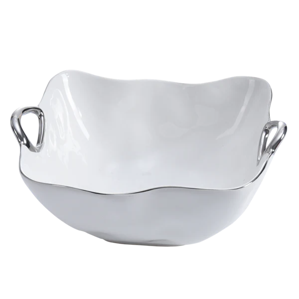 Tazón grande con asa y estilo. Tazón de tamaño generoso para servir ensaladas, pastas o guarniciones. Impresionante porcelana blanca con asas suaves y fluidas de titanio plateado. Apto para alimentos, lavavajillas y horno hasta 260 °C. Fácil de limpiar.